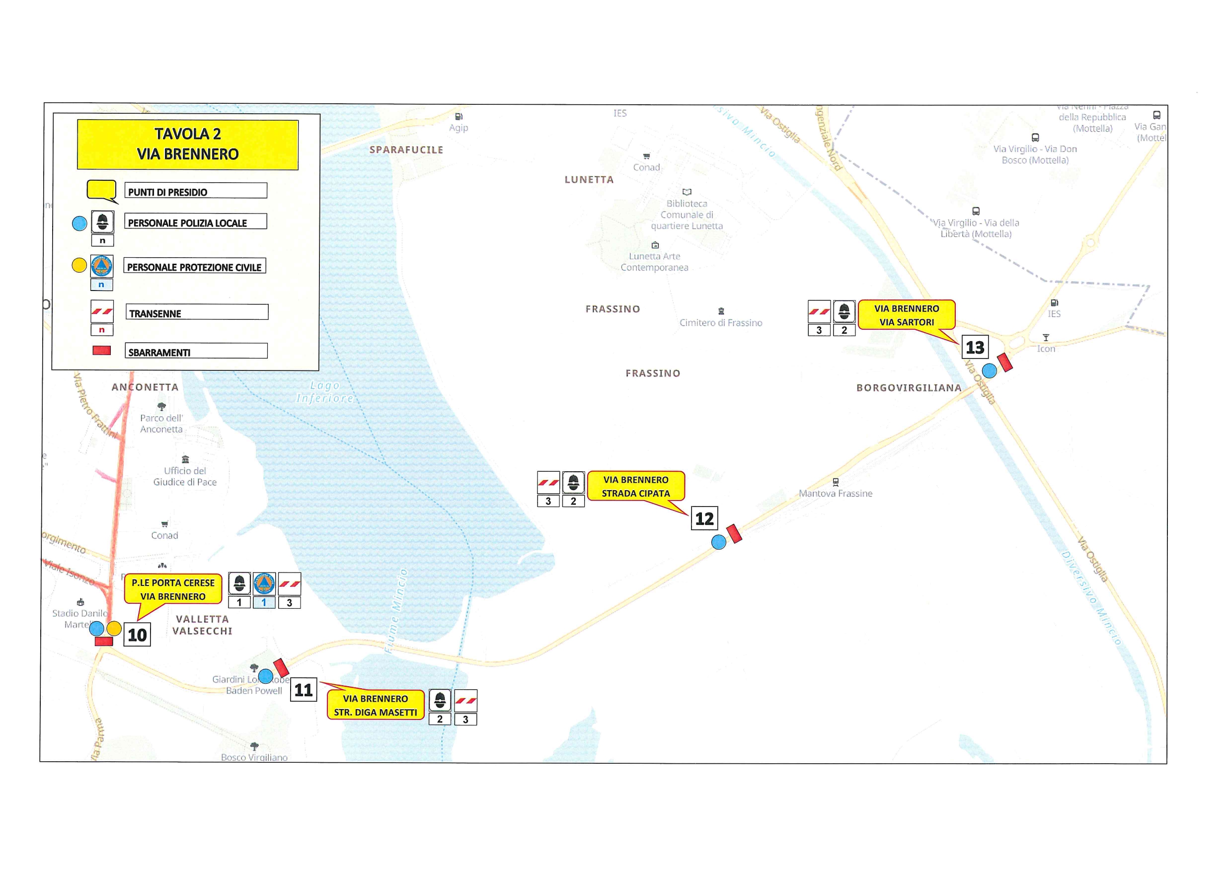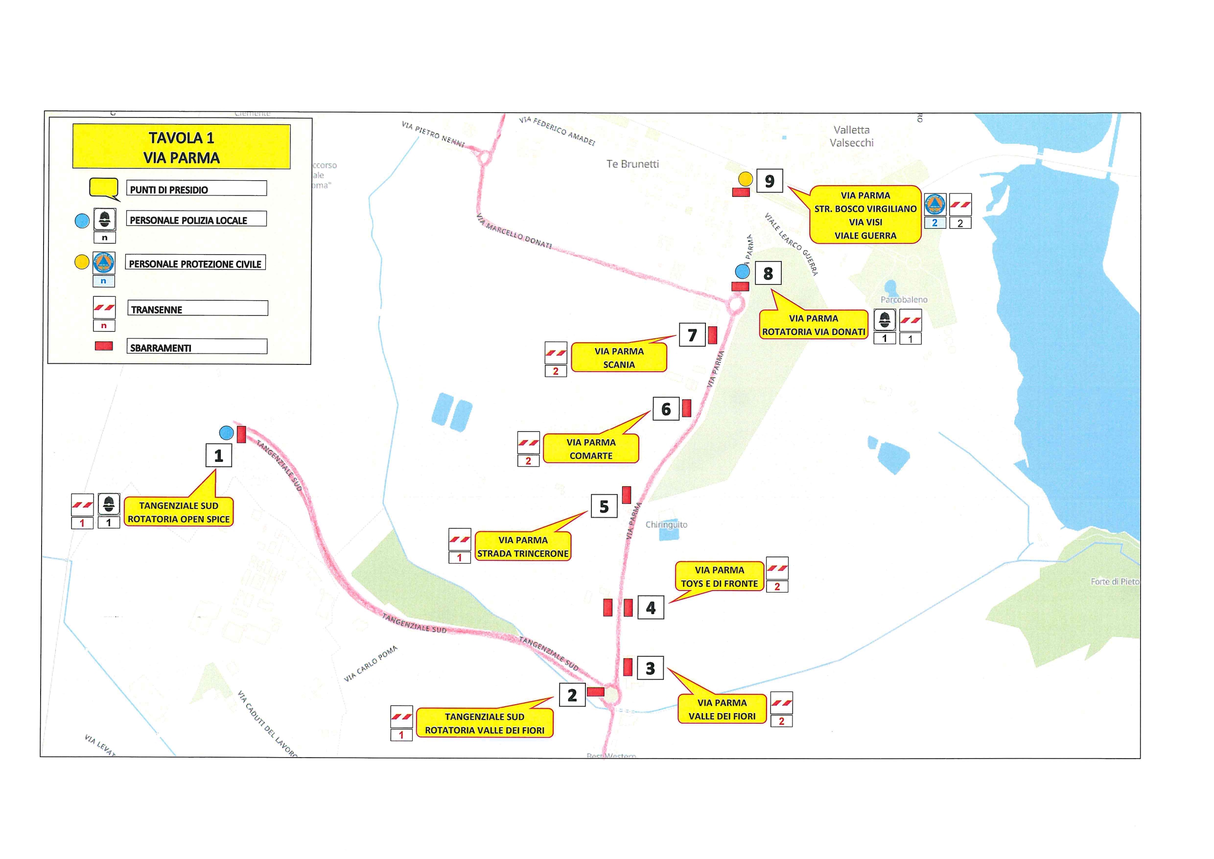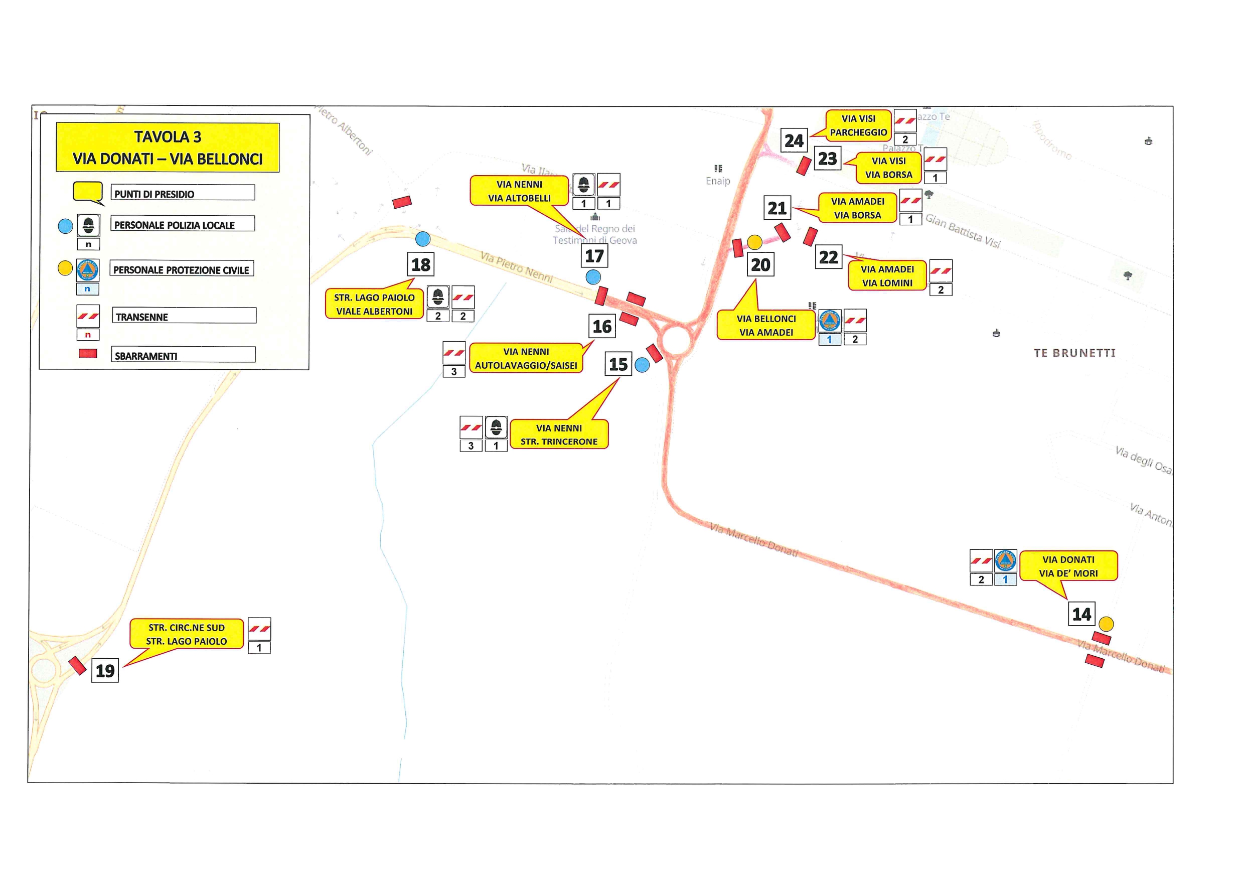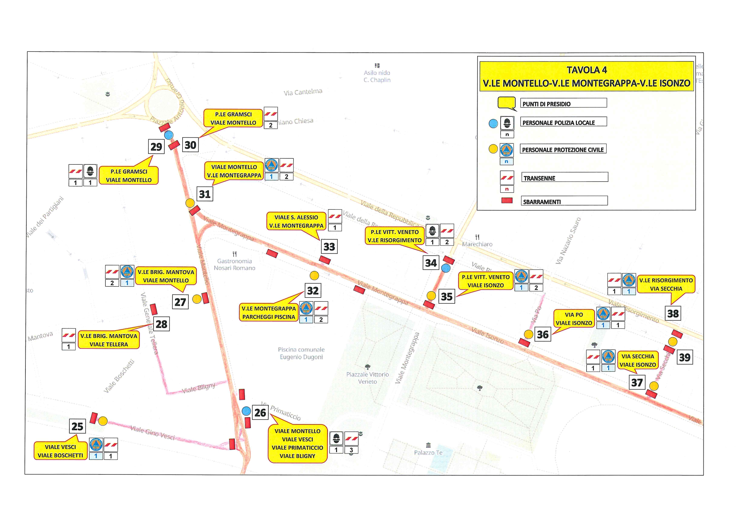 Nelle tavole sottostanti si possono vedere nel dettaglio i punti di presidio, il personale impiegato, le aree transennate e gli sbarramenti.