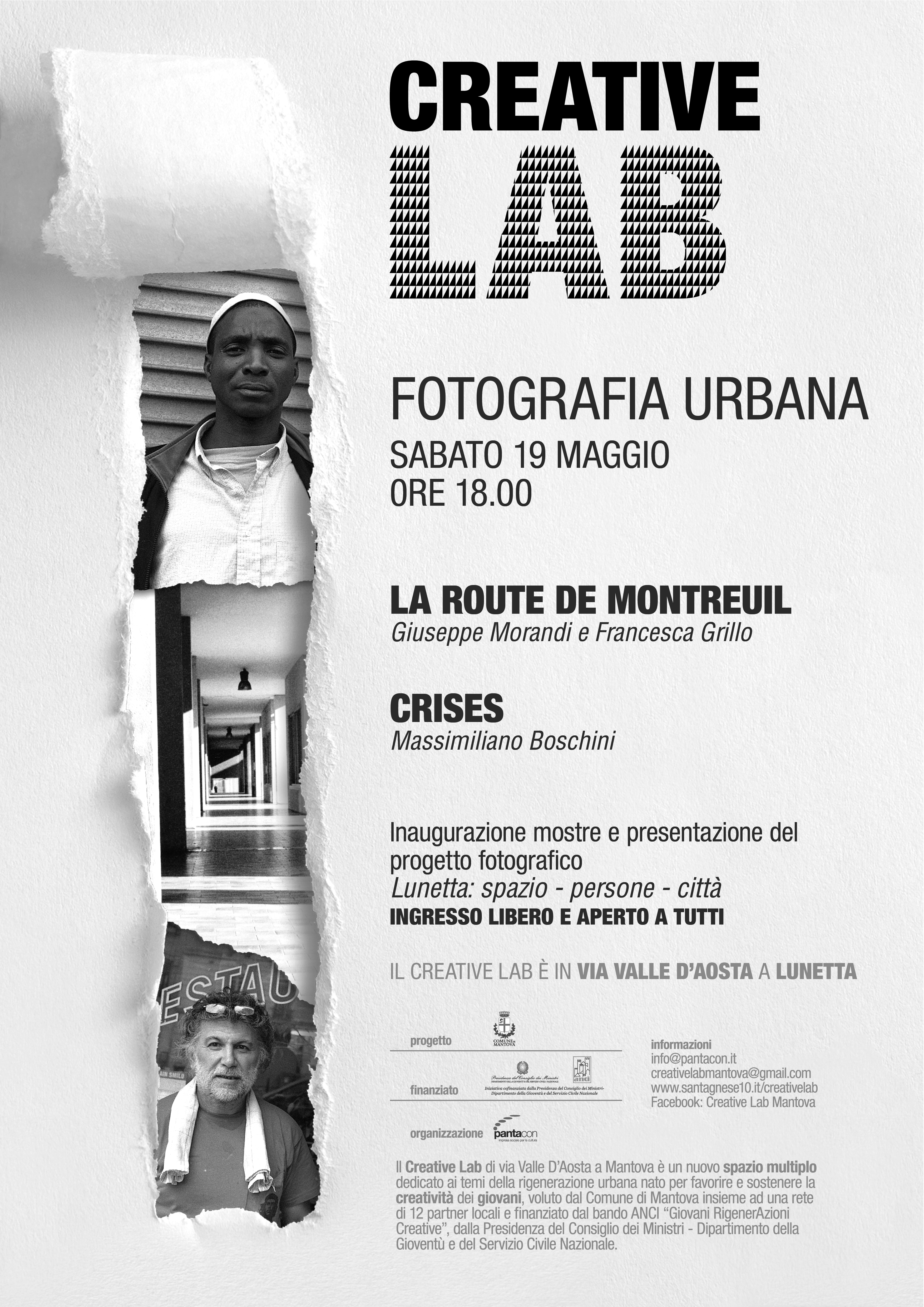 Per promuovere questa operazione il Creative Lab ospita nei suoi spazi due mostre fotografiche: Crises, una sintetica suggestione per immagini del quartiere Lunetta prodotta dal fotografo mantovano Massimiliano Boschini e Route de Montreuil, una ricerca sociale e politica in una cittadina multietnica limitrofa alla Parigi contemporanea realizzata nel 2011 e nata dall’incontro tra il fotografo della civiltà contadina della Lega di cultura di Piadena Giuseppe Morandi e Francesca Grillo.
