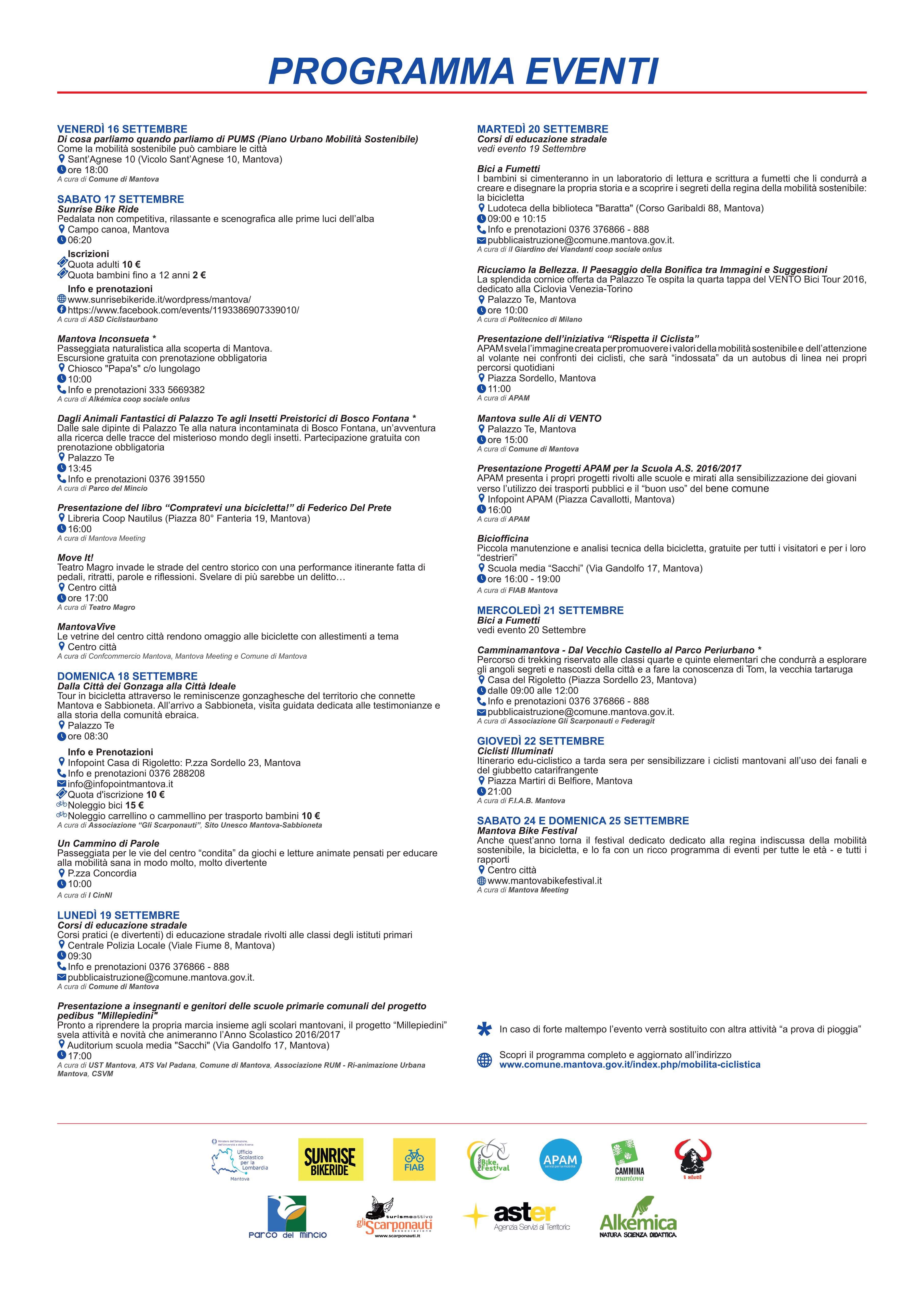 Il programma è ricco di eventi con la bicicletta, come la pedalata alle prime luci dell'alba, sabato 17, organizzata da Surise Bike Ride, la biciclettata da Mantova a Sabbioneta proposta dall'associazione "Gli Scarponauti" domenica 18, le visite naturalistiche condotte da Alkemica e gli incontri culturali alla Biblioteca Baratta. La Fiab di Mantova attiverà presso la Scuola Media Sacchi un laboratorio di piccola manutenzione gratuita della bicicletta e guiderà l'itinerario in notturna di giovedì 22, "Ciclisti illuminati", per l'educazione all'uso dei fanali e del giubbetto catarifrangente che verranno regalati dall'Aster ai partecipanti. Teatro Magro che invaderà le strade del centro storico con una performance itinerante fatta di pedali, ritratti e narrazioni misteriose nella notte bianca di sabato 17 settembre.