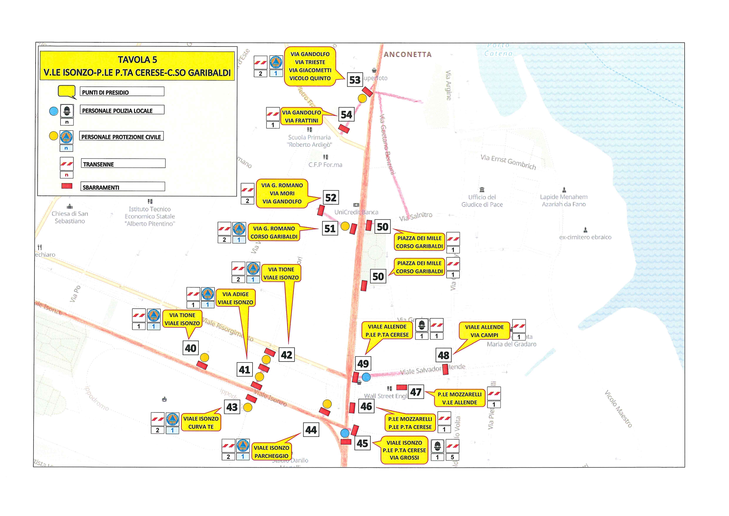 Nelle tavole sottostanti si possono vedere nel dettaglio i punti di presidio, il personale impiegato, le aree transennate e gli sbarramenti.