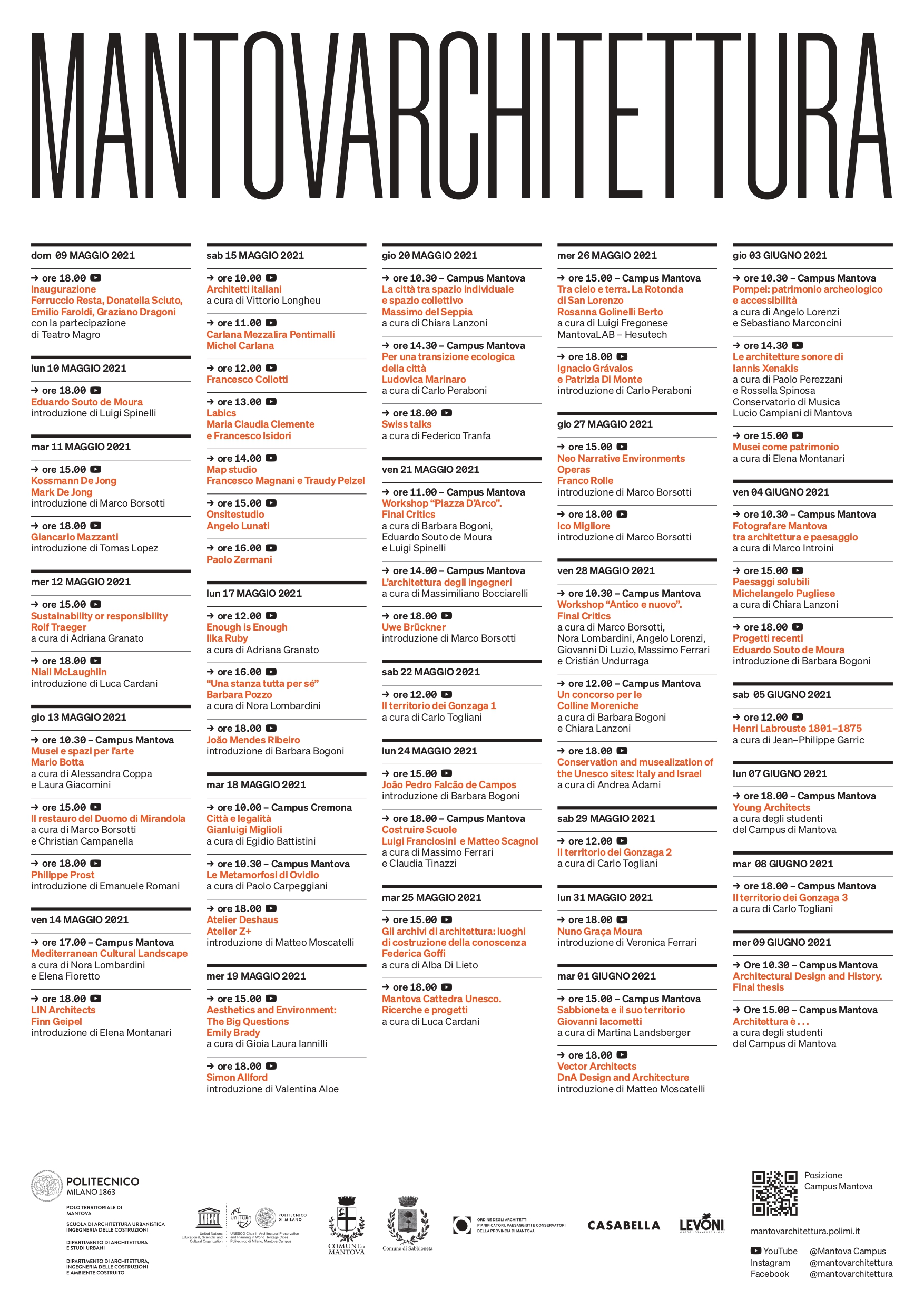 Con la consulenza scientifica della rivista “Casabella” e il sostegno delle amministrazioni comunali di Mantova e Sabbioneta, di Palazzo Ducale, dell’Ordine degli Architetti di Mantova, Mantovarchitettura si terrà in una modalità mista, con alcuni appuntamenti in presenza (nel rispetto delle regole che garantiscano la partecipazione in sicurezza), alternati ad eventi trasmessi in diretta o registrati, anche in location dal grande valore storico e architettonico per il territorio mantovano (Teatro Bibiena a Mantova e Teatro all’Antica di Sabbioneta).
